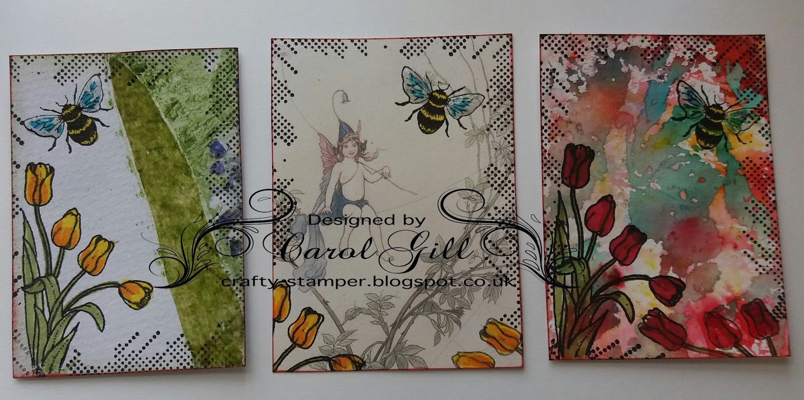 The first one was using a leftover scrap made putting flowers and leaves through the big shot/Chocolate Baroque bee/tulip stamp was a freebie --stamps coloured with promarkers.