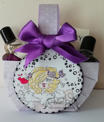I used the beautiful image Bubbles coloured with promarkers and added glossy accents.I made a gift basket with paper from The Works,ribbon and tissue paper from stash and added some miniture soap/shower gel/body lotion and Shampoo.